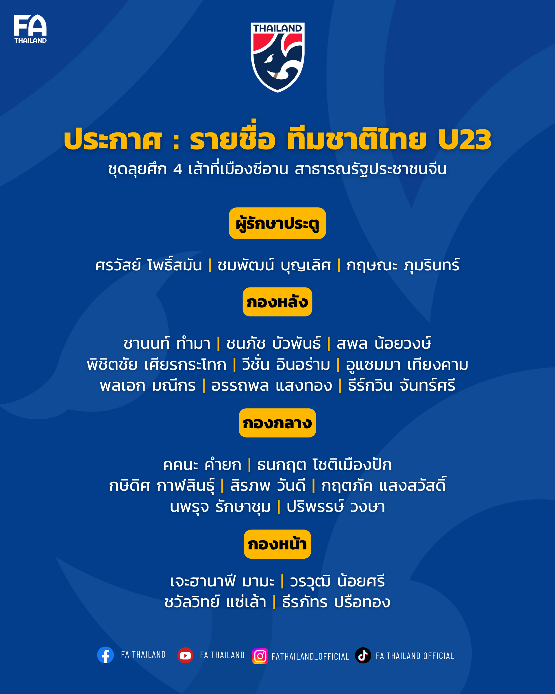 สมาคมกีฬาฟุตบอลแห่งประเทศไทย ในพระบรมราชูปถัมภ์ ประกาศรายชื่อ 23 นักฟุตบอลชายทีมชาติไทย รุ่นอายุไม่เกิน 23 ปี ทำการแข่งขันฟุตบอลรายการ CFA Team China International Youth Tournament Xi'an ที่เมือง ซีอาน สาธารณรัฐประชาชนจีน ในช่วงฟีฟ่า เดย์ เดือน มีนาคม ภายใต้การคุมทัพของ "โค้ชวัง" ธวัชชัย ดำรงอ่องตระกูล หัวหน้าผู้ฝึกสอน